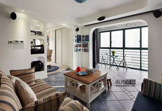 地中海風格中的茶幾,和木紋飾面的沙發相映成趣,中空處擺上盆栽,仿佛成了一個小展館。