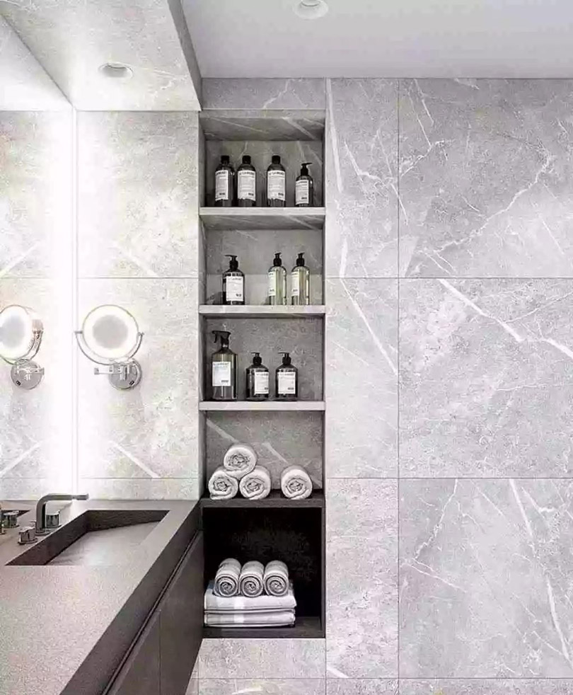 大部分戶型圖中衛生間都不是方方正正的,會有各種各樣的不規則形狀。那么在裝修的時候如何巧妙的利用這些空間就很有必要啦!在這些不起眼的地方做出壁龕不僅增加了衛生間的收納空間,還能使衛生間更加美觀,格調滿滿。