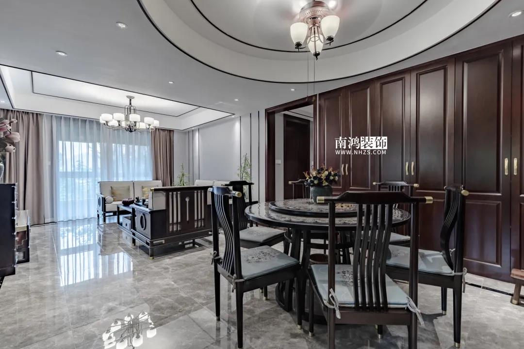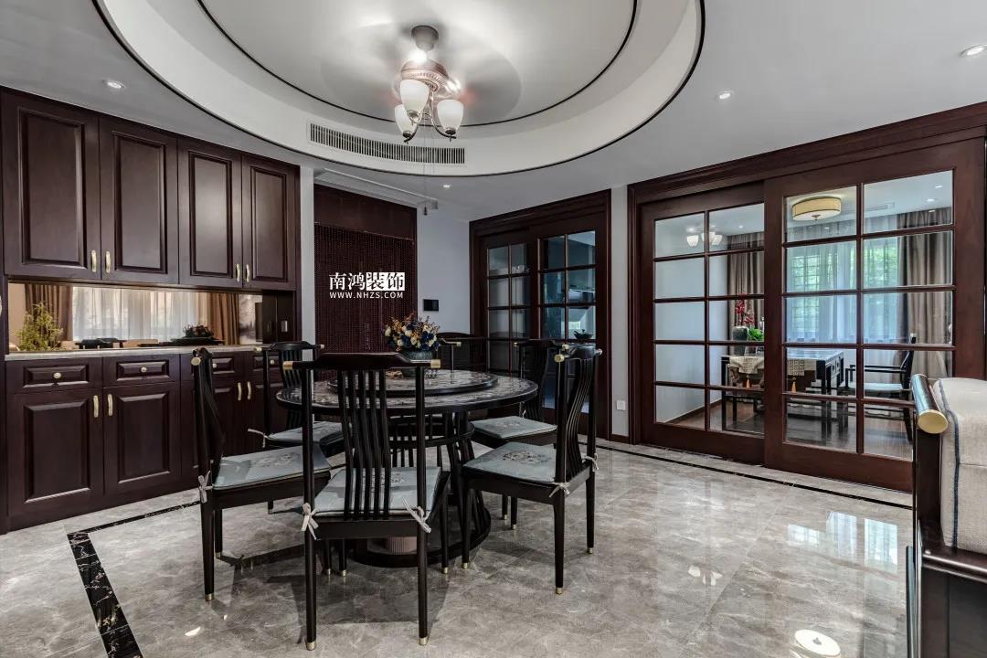 餐廳與廚房、書房相鄰,上方設計圓頂,上下呼應,寓意著“團圓”,同時餐邊柜做寬以增加儲藏量。