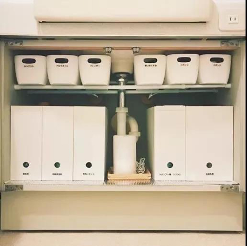 四個字——“整拿整取”,把物品按照屬性或者使用場景進行分類,裝進收納盒里,貼上標簽,要用的時候直接拿收納箱就可以了。